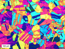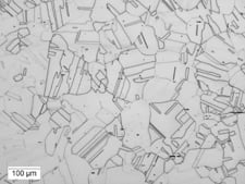 | Microstructure of a stainless 330 sample in annealed condition @ 100x, using a tint etch consisting of a solution of 40 ml hydrochloric acid (MCL) + distilled water (H2O) + one gram potassium meta bisulfite (K2S2O5) + 4 grams ammonium biflouride (NH4F–HF) at room temperature. |