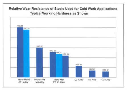 At first glance, the broad range of candidate alloys may seem confusing. The final choice, however, should always depend on what combination of properties is needed in the tooling material. Usually, the best choice for cold work tooling applications will be the right tradeoff between wear resistance and toughness.