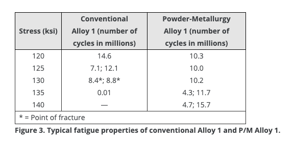 Also, powder processed stock can be made without the need for cold drawing and annealing, which can be detrimental to fatigue strength.