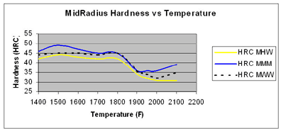 Figure 11. Midradius hardness profile of P/M Alloy 1 (HRC MMM) vs. hot worked (HRC MHW)
