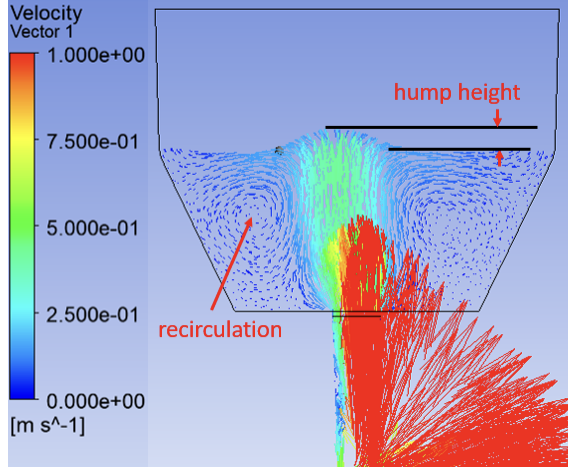The model also predicted that during the initial stages of teeming, momentum in the vertical direction from the incoming jet was high enough to create a hump in the metal front, as shown in Figure 2. Larger fluctuations in hump height2 and high horizontal velocity may lead to slag entrainment problems. In a worst-case scenario, the high horizontal speed of metal can drag mold powder to the sides, creating a bare surface or “eye”, exposing metal to air. If the mold flux bag is placed too low, the higher horizontal component of velocity and higher level-fluctuations could increase slag entrainment and thereby deteriorate metal cleanliness.