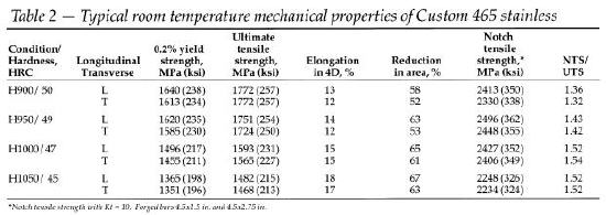 Typical room temperature mechanical properties for Custom 465 stainless can be seen in Table 2. Custom 465 stainless is capable of about 260 ksi (1795 MPa) ultimate tensile strength if peak aged (H900 condition). In this condition, it still retains high notch tensile strength and fracture toughness.