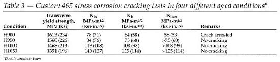 Double-cantilever-beam tests conducted in 3.5% NaCl (pH 6), at room temperature, show that Custom 465 stainless possesses inherently good resistance to stress corrosion cracking in the over-aged condition. That resistance, furthermore, improves (i.e. - the KIc increases) with increasing aging temperature (Table 3).
