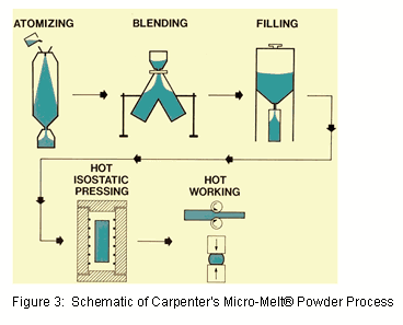 While in many cases traditional fusion/fixation devices have proven successful, they do tend to limit patient mobility. Recently, in order to satisfy one of the needs of the high demand patient, there has been an increasing trend towards non fusion alternatives, including dynamic stabilization, artificial discs, and other motion preserving techniques. In these cases, higher performance alloys may be required that exhibit enhanced wear resistance, finer microstructure or higher fatigue strength. These attributes can be achieved when utilizing alternative alloy processing techniques like Carpenter’s proprietary Micro-Melt® process. In this process, the alloy is melted and then atomized into a fine powder by introducing the molten metal to a high-pressure stream of gas. This powder is then blended and screened to a controlled diameter and finally consolidated into a solid ingot of material which can then be processed to the required finished diameters (Figure 3).
