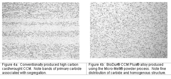 Many disc designs are either already on the market or currently in product development. Some of these designs utilize titanium alloys, some use stainless, some use cobalt, and others use ceramics, PEEK or elastomer components. Each shares one common attribute: the need for a wear-resistant and highly polishable bearing surface. Micro-Melt® BioDur® CCM Plus® has shown to be beneficial for this type of application. Micro-Melt® BioDur® CCM Plus® is manufactured using the Micro-Melt process. As such, it results in an alloy that meets ASTM F1537 Alloy 2 high carbon chemistry, but has the added benefit of superior microstructural uniformity versus other high carbon cobalt-chrome-moly grades on the market (Figure 4a & 4b).