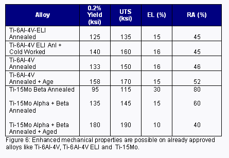Another active trend in the spine segment is the adoption of dynamic stabilization devices. Like artificial discs, numerous systems are either already introduced, in development or submitted for approval with the FDA. The use of higher-performance alloys and/or existing alloys in higher-strength conditions has been a trend for these devices. For example, utilizing already approved Ti alloys like Ti-6Al-4V/ELI, Ti-6Al-7Nb and Ti-15Mo in a strain-hardened condition or an annealed + heat-treated condition provides enhanced mechanical properties, which help meet the needs of these more demanding applications (Figure 6).