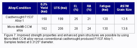 Micro-Melt® BioDur® CCM Plus® has seen increasing use in small-diameter (under 8mm) spinal rod applications. This alloy, manufactured using the proprietary powder process, develops higher strength, finer grain structure and increased fatigue strength over conventional cast/wrought produced ASTM F1537 Alloy 1 cobalt chrome alloys (Figure 7).