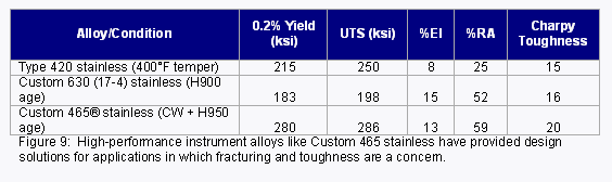 In addition to implants that last longer and provide better solutions for the patient, there has also been a trend toward the adoption of surgical techniques that are less invasive for the patient. Higher performance alloys produced to tighter tolerances can help facilitate MIS technology by allowing for the design of smaller, more durable, more flexible and higher strength instruments and implants. For example, Carpenter’s Custom 465® stainless has helped provide numerous design solutions for instruments that require higher strength and improved toughness (Figure 9). Additionally, Dynamet’s Titanium ULTRABAR product has provided the ultra-tight dimensional tolerances and exceptional diameter uniformity required for some titanium MIS implants. Titanium ULTRABAR can provide diameter tolerance control down to 0.00015” in bar sizes from 3-12mm and lengths up to 14 feet in a variety of implantable titanium alloys.