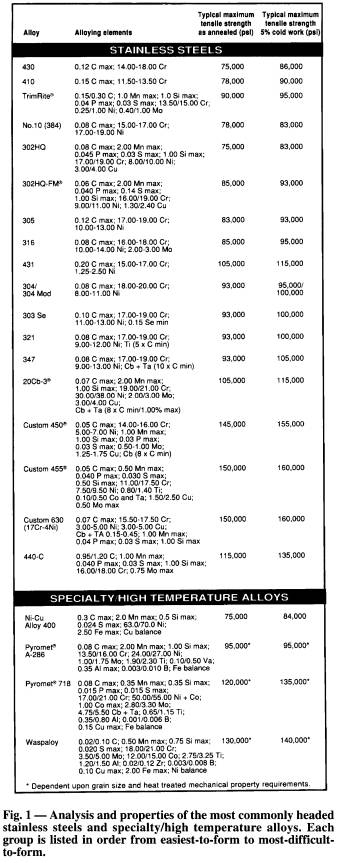 An alloy's chemical composition determines its work hardening rate. The compositions and properties of the headable stainless steels and high temperature alloys are shown in Fig. 1, in descending order from easiest-to-head to most difficult-to-head.