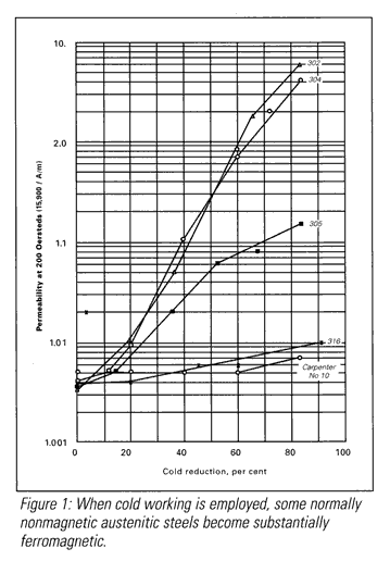 The magnetic permeabilities achievable in austenitic stainless steels are very low compared with conventional magnetic materials such as silicon-iron alloys. Therefore, their non-magnetic behavior is more of a concern. Certain uses such as housings and components for magnetic detection equipment used for security, measuring and control purposes require that the steel be nonmagnetic. That is because the presence of even weakly ferromagnetic parts can adversely affect performance. Unless the austenitic stainless steel parts are used in the annealed condition and are not subjected to deformation during use, a higher nickel grade would be a prudent choice assuming it offered the appropriate corrosion resistance and strength.