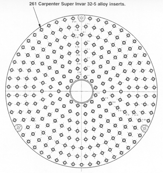 Fig.1 - This drawing shows the 8.3-meter primary morror with 261 Carpenter Super Invar 32-5 alloy inserts geometrically arranged in as many glass holes.