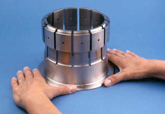 To make each sleeve, Contraves Brashear cut sections from the cylindrical hollow bars; rough machined five different diameters, including slots, fingers and holes; stress relieved by a proprietary process; finish machined; stress relieved again and finally, applied an electroless nickel plating of 0.0005" thickness to provide corrosion resistance. When finished, each Super Invar sleeve weighed 5.7 lbs.