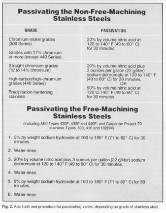 Cleaned properly, the work piece is now ready for immersion in the passivating acid bath. As seen in Fig. 2, composition of the acid bath depends upon the grade of stainless steel.