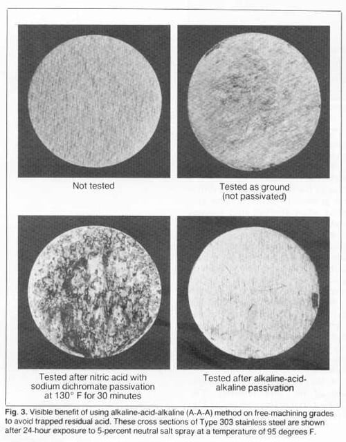 The benefits of using the A-A-A method are demonstrated in Fig. 3. Ground cross-section samples of Type 303 were exposed to a 5-percent salt spray for 24 hours (95 degrees F). The sample passivated only in nitric acid with sodium dichromate was severely rusted due to acid retention where sulfides had been removed. The A-A-A sample was essentially free from rust because retained acid was neutralized. The as- ground sample, top right, (not passivated) displayed only light rust, probably because there was not much opportunity for shop dirt (containing free iron) to contact the machined surface.