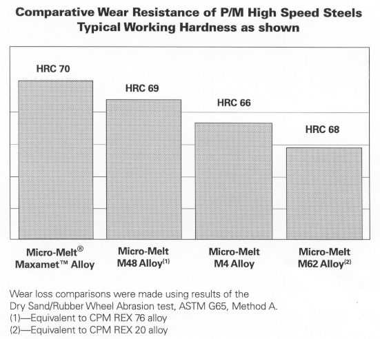 The wear resistance of Carpenter Technology Micro-Melt Maxamet alloy is compared with that of three other PM high speed steels at typical working hardness in Fig. 4. Wear loss comparisons were made using results of the Dry Sand/Rubber Wheel Abrasion test, per ASTM G65, Method A. The highest bar shows the most wear resistance and the shortest bar the least wear resistance. For further improved wear resistance, a CVD or PVD coating may also be applied.