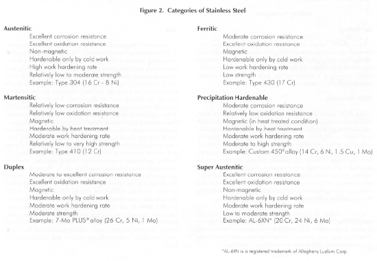 Discussion of the different types of stainless alloys, especially from a technical standpoint is beyond the scope of this paper. A comprehensive reference is the Handbook of Stainless Steels by Peckner and Bernstein1, and an extensive list of topics is covered in various volumes of the Metals Handbook by ASM2. The commonly recognized categories and a brief summary of characteristics is shown in Figure 2.