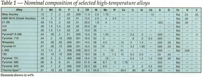 Alloy selection is dependent on mechanical property requirements (i.e. - strength, creep, fatigue) as well as the maximum exposure temperature. Compositions, mechanical properties and practical service limits of typical high temperature alloys are shown in Tables I, II and III, respectively.